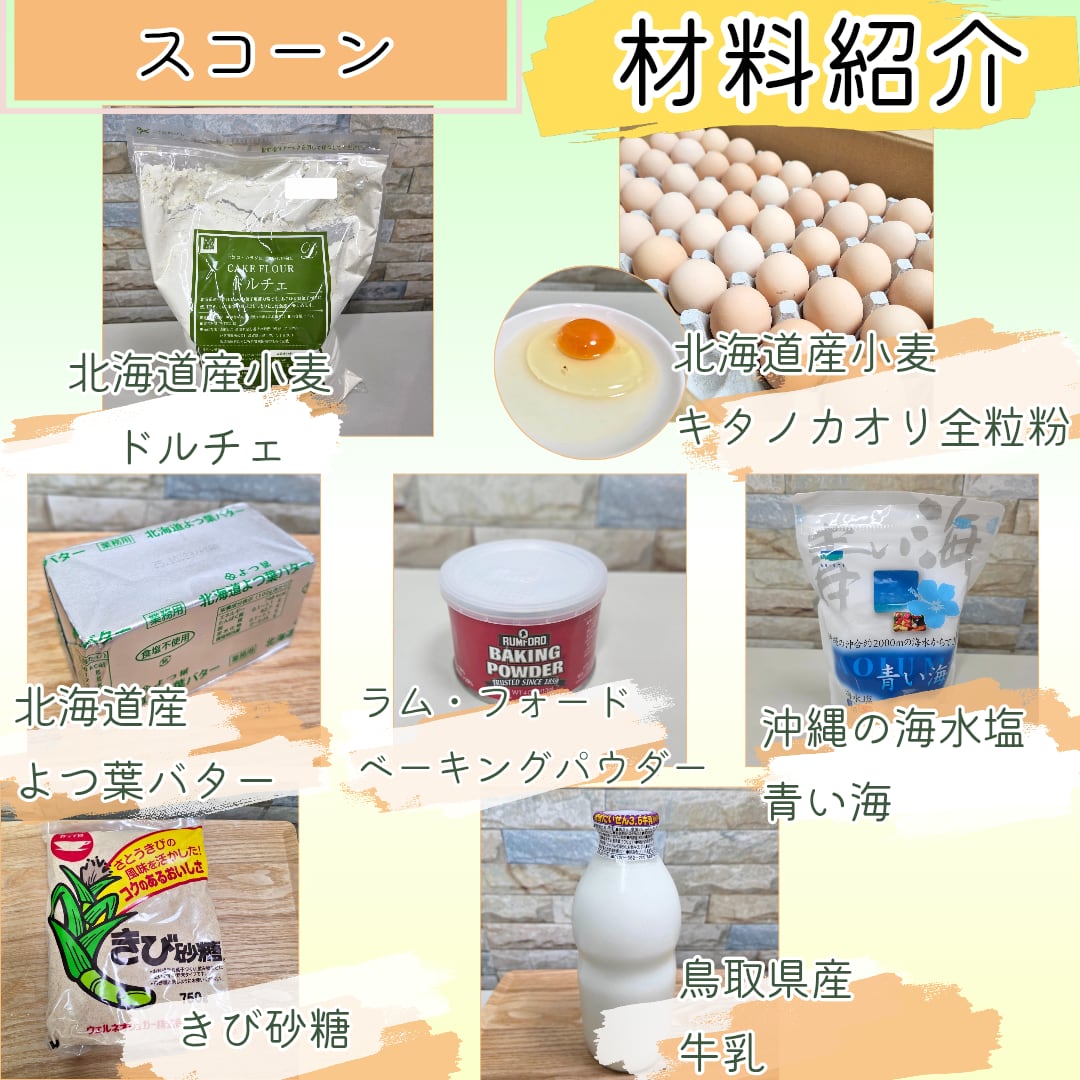 北海道産小麦の小麦粉を100%使いよつ葉バター・太陽卵・鳥取県産牛乳・きび砂糖・ラムフォードベーキングパウダーを使用しサクふわ食感に焼き上げたスコーンです。