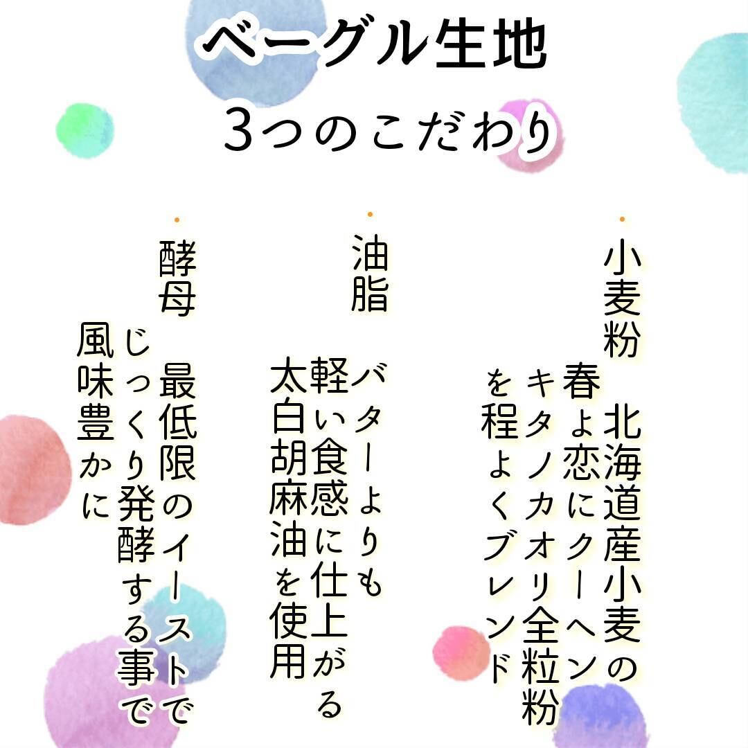 国産小麦100%使用のベーグル、小麦粉は春よ恋にキタノカオリ全粒粉とクーヘンを使って小麦の香りと食物繊維も含んだ生地を一晩冷蔵発酵させてモルトエキスで茹でて焼き上げた外はバリッと中はふわもちの本格派のベーグルです。