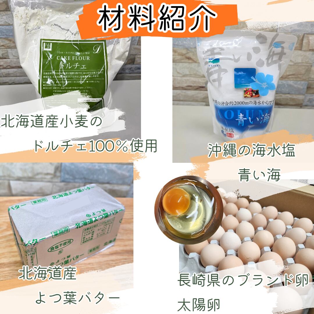 北海道産小麦の「ドルチェ」を100%使用し長崎のブランド卵「太陽卵」と北海道産よつ葉バター・グラニュー糖・チアシードに水分は牛乳を使用そしてミョウバン不使用のベーキングパウダーを使って作ったサクふわの重たくない軽い食感のワッフルです。
