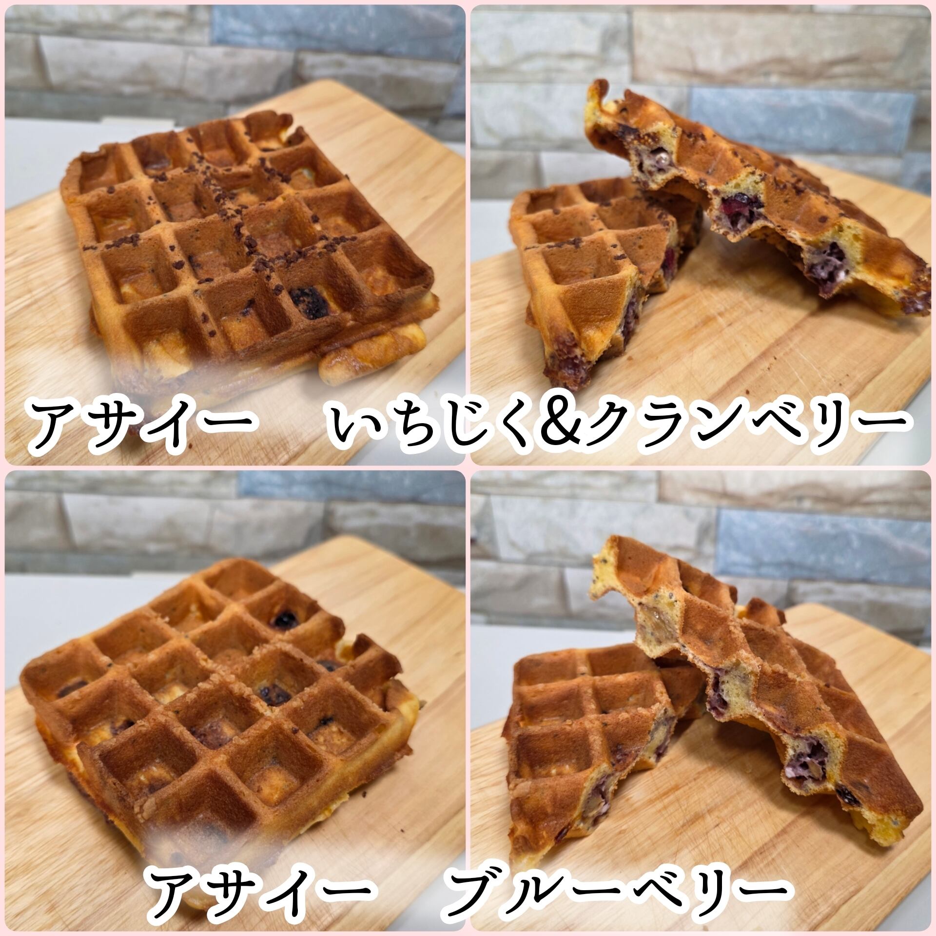 アサイーとドライフルーツのワッフルやアサイーとナッツのワッフルなど9種類の豊富な選べるラインナップです。