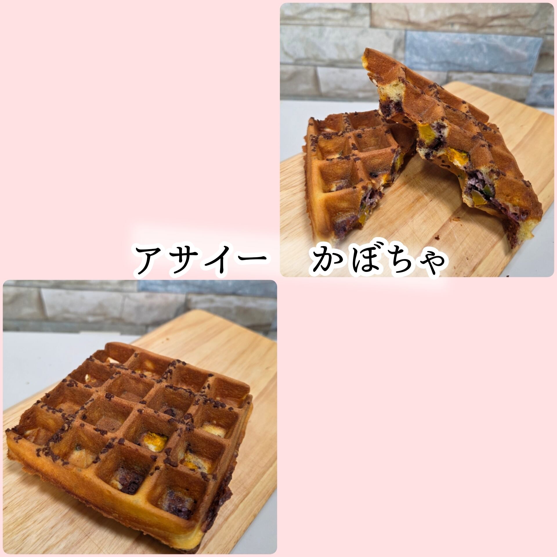 アサイークリームとかぼちゃとチョコチップ、ひまわりの種、チョコクランチを使ったワッフル。