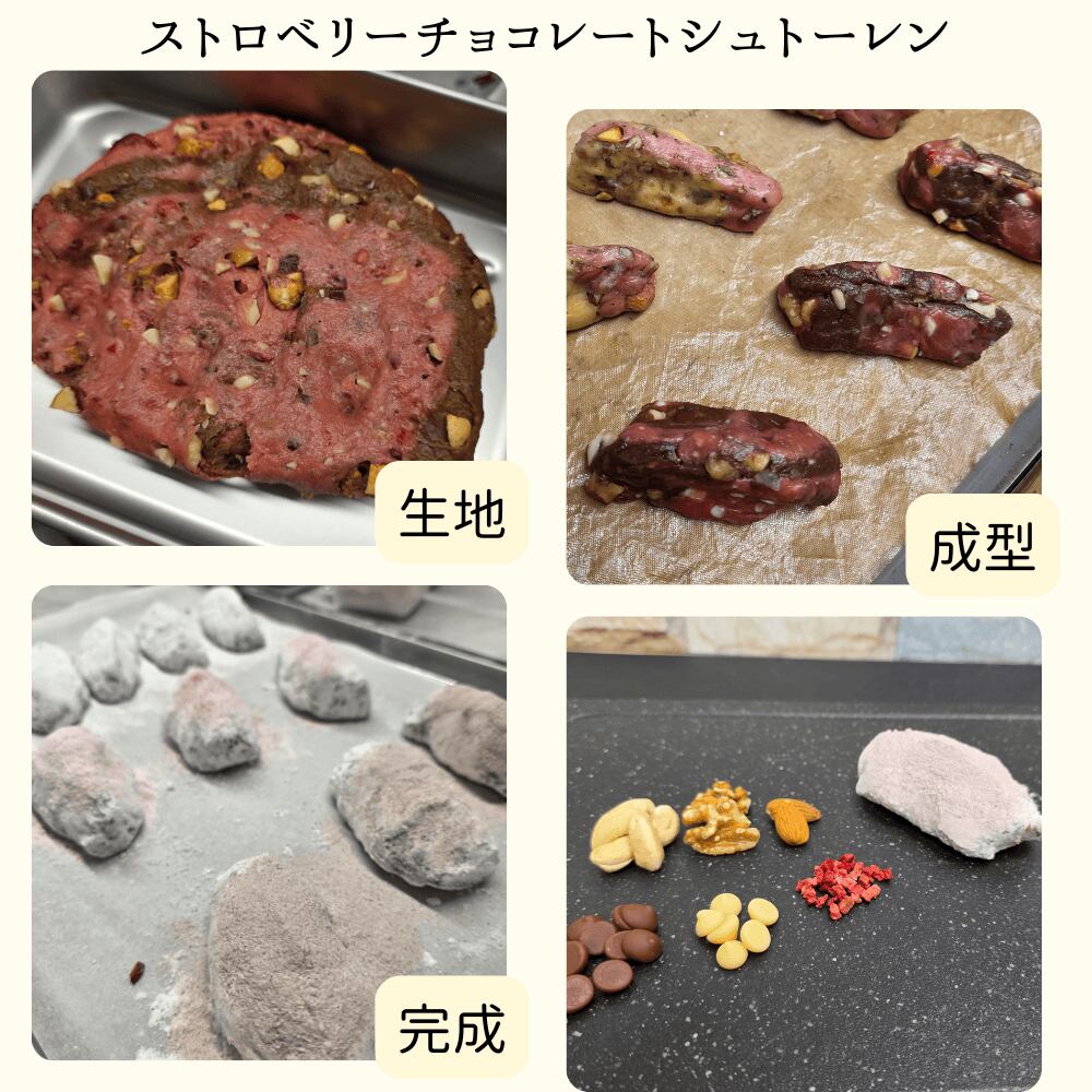 生地にいちごパウダー・ココアパウダーをはじめフリーズドライいちご・ベルギー産ミルクチョコレート&ベルギー産ホワイトチョコレートを加えナッツはアーモンド・カシューナッツ・くるみそして手作りレモンピールをたっぷり使いチョコといちごのマーブルに焼き上げました。