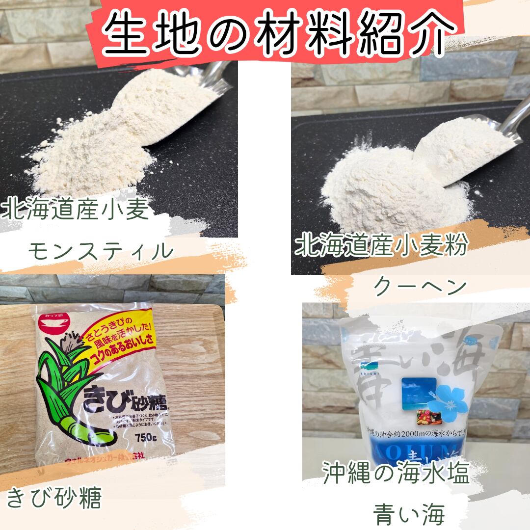 小麦粉は北海道産小麦の「モンスティル」と「クーヘン」を100%使用しきび砂糖・よつ葉脱脂粉乳・塩は青い海・太陽卵の卵黄・よつ葉バター・手作りマジパンローマッセを使用しております。