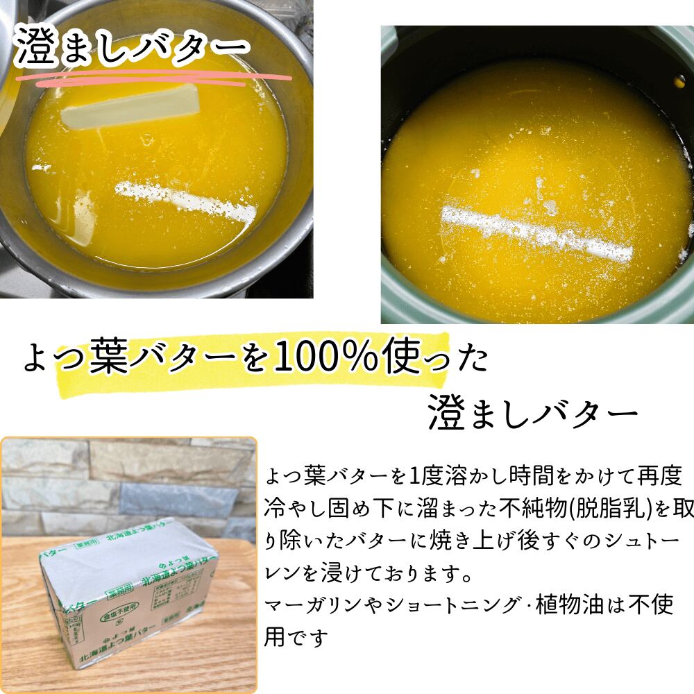 焼き上げ後につける澄ましバターもよつ葉バターを100%使用、表面の砂糖は「細目グラニュー糖」「純粉糖」「溶けない粉糖」の3層仕立てです。