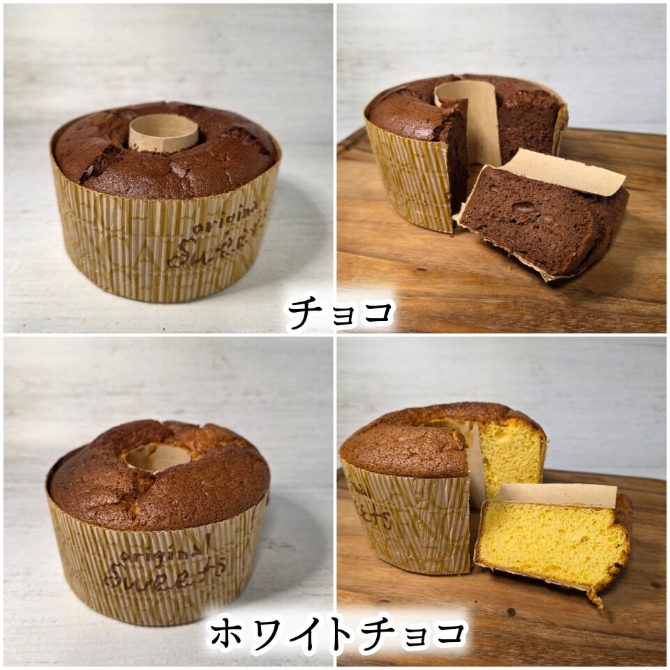 太陽卵に国産小麦とベルギー産チョコレートなどを使った3種類から選べるスモールサイズのチョコレートシフォンケーキです♪