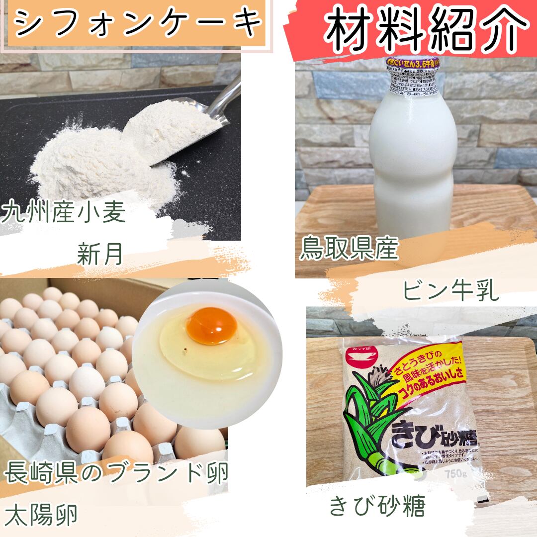 長崎県産ブランド卵太陽卵を100%使い・九州産小麦・鳥取県産牛乳・太白ごま油・きび砂糖を使用しベーキングパウダー不使用で作りました。