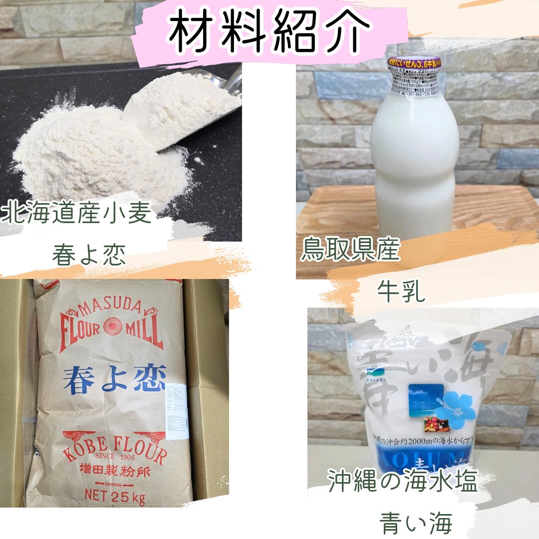 小麦粉は増田製粉所の北海道産小麦の「春よ恋」を100%使用し鳥取県産のビン牛乳を水分の約56%の割合で使いきび砂糖・よつ葉脱脂粉乳・よつ葉バター・沖縄県の塩「青い海」そしてイーストは小麦とミルクの香りを引き立てるサフ社の「セミドライイースト ゴールド」・こんがり焼き色をつけるモルトパウダーを使用してオーバーナイト中種法で焼き上げました。