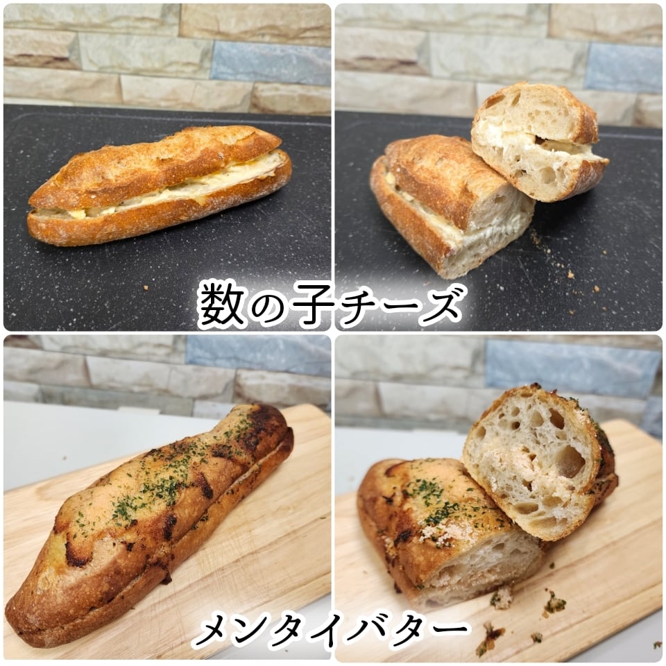 博多名物の無着色辛子明太子とマヨネーズ、よつ葉バターを混ぜて作ったメンタイバターをフランスパンに中と上にたっぷり50g使って焼き上げた、明太子のピリッと感とバターのジュワっした味わいのメンタイバケットです。