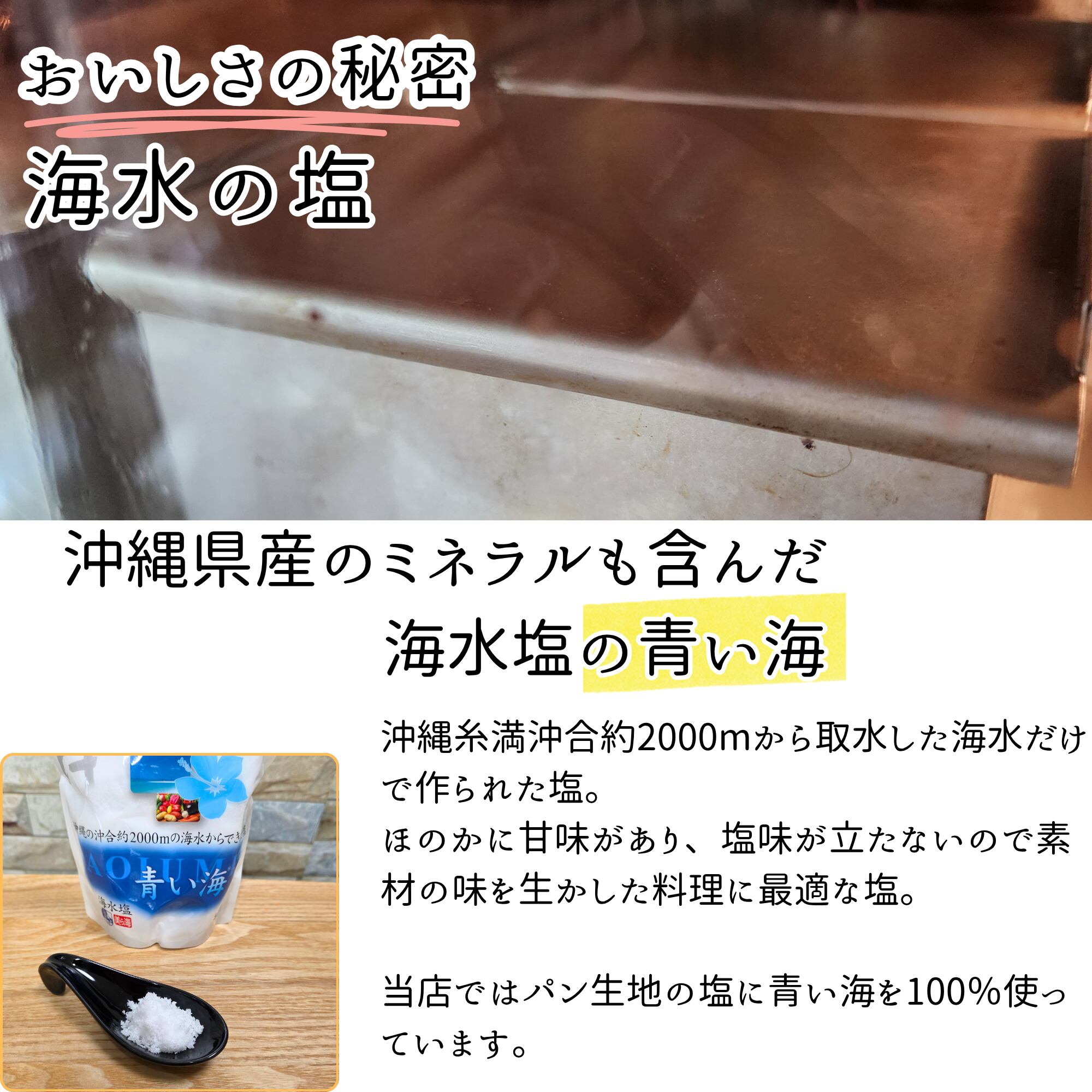 小麦粉は増田製粉所の北海道産小麦の「春よ恋」を100%使用し鳥取県産のビン牛乳を水分の約56%の割合で使いきび砂糖・よつ葉脱脂粉乳・よつ葉バター・沖縄県の塩「青い海」そしてイーストは小麦とミルクの香りを引き立てるサフ社の「セミドライイースト ゴールド」・こんがり焼き色をつけるモルトパウダーを使用して焼き上げました。
