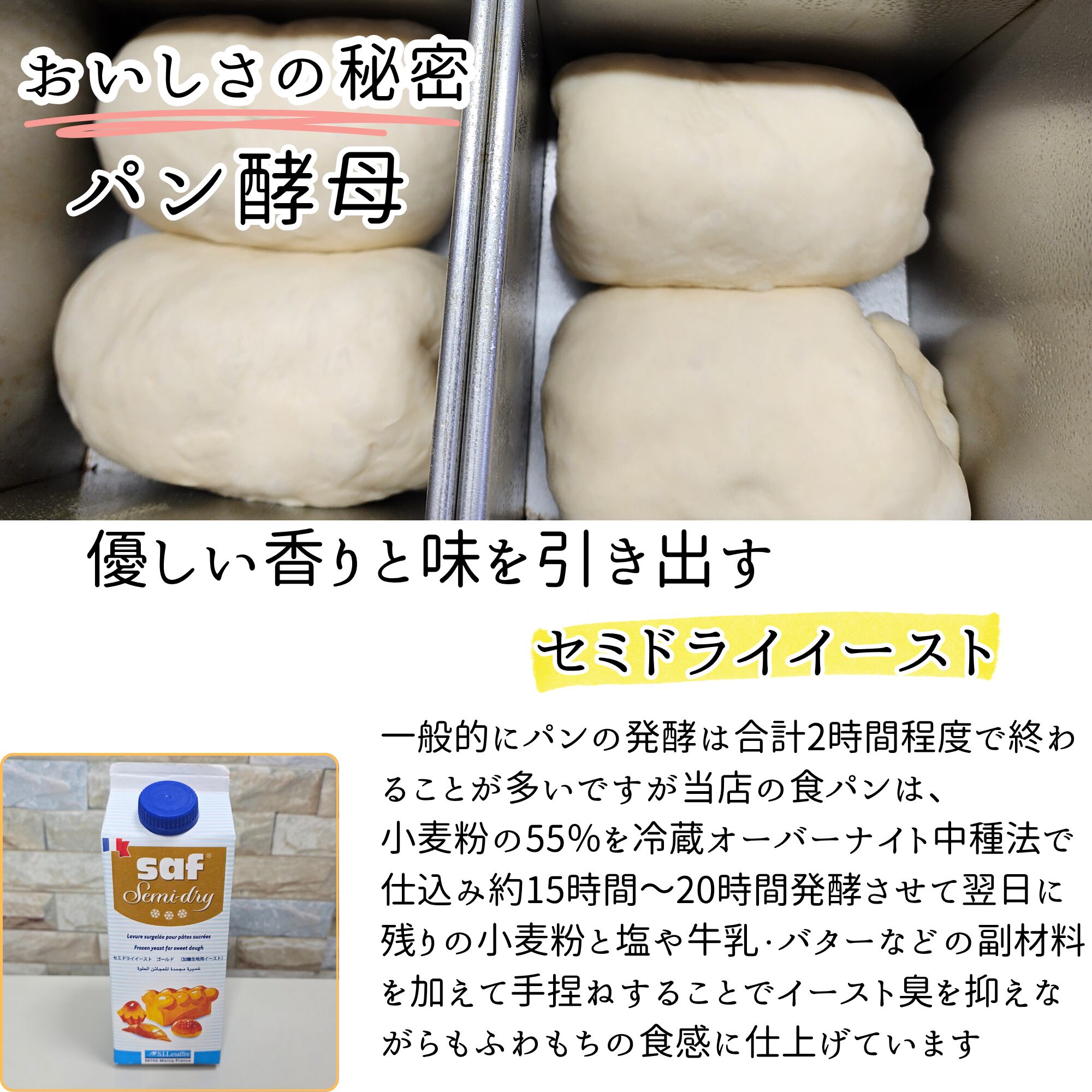 小麦の旨味を引き立てるため使う春よ恋小麦粉の55%で中種を作り冷蔵庫で約15時間~20時間熟成発酵させて残りの小麦粉と塩や牛乳・バターなどの副材料を加えて手捏ねし更に60分×2回約2時間発酵させて高火力なコンベクションオーブンで焼き上げました。