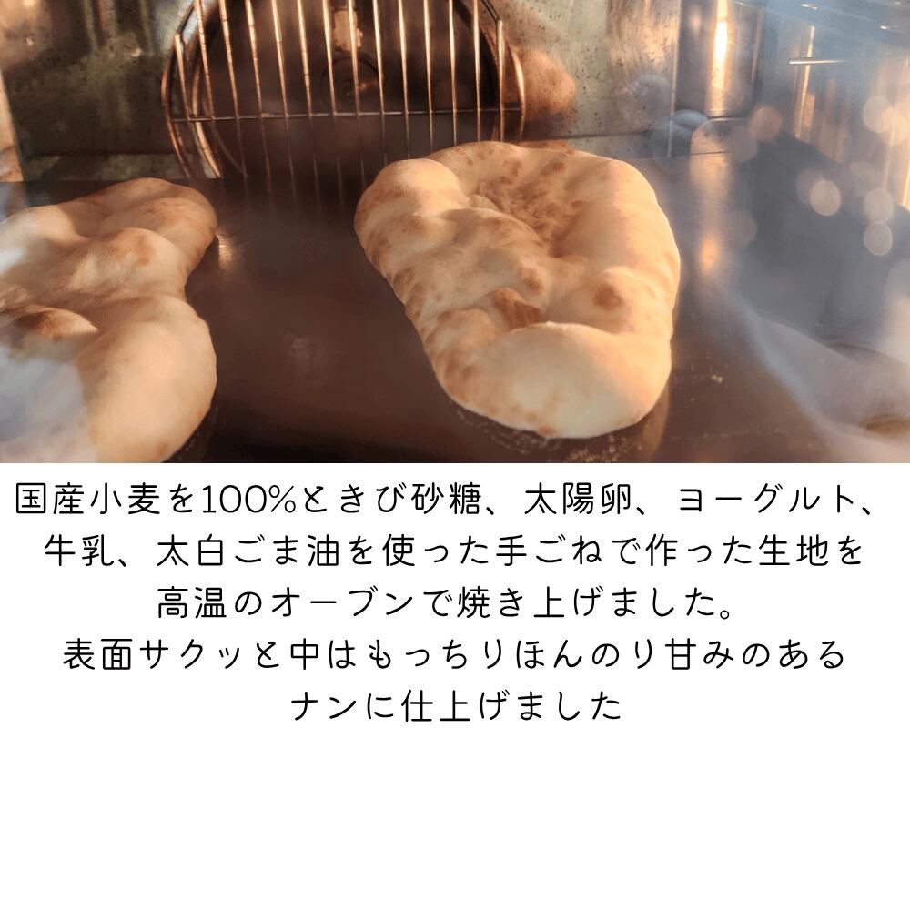 北海道産小麦の春よ恋を60%と九州産小麦の南のめぐみを40%使ってさらにきび砂糖、大陽卵、ヨーグルト、牛乳、太白ごま油を使って中種法で作り高温のオーブンで焼き上げ仕上げに澄ましバターを塗りました、表面さくっと中はもっちりほんのり甘いコクのあるナンに仕上げました!