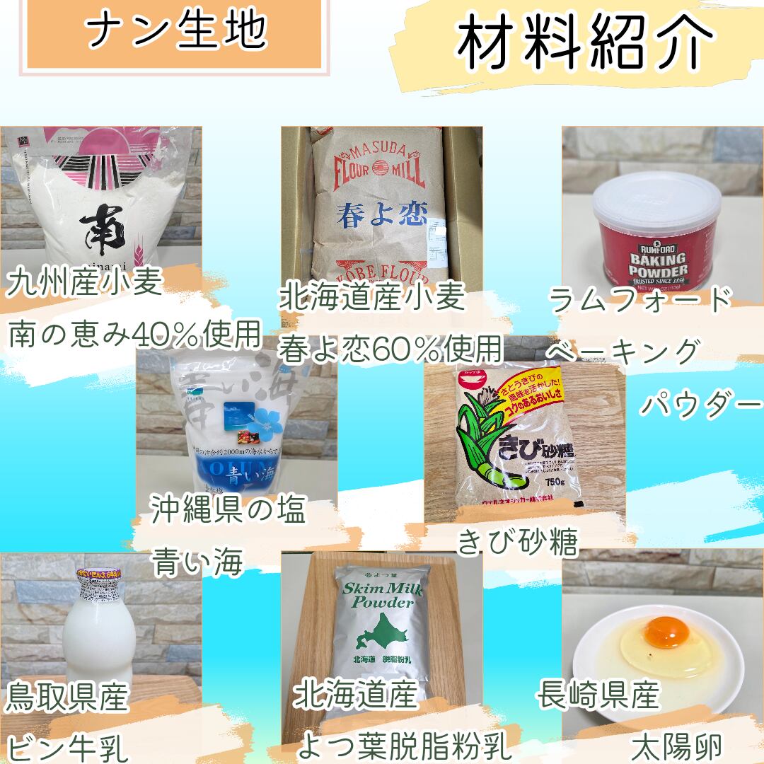 北海道産小麦の春よ恋を60%と九州産小麦の南のめぐみを40%使ってさらにきび砂糖、大陽卵、ヨーグルト、牛乳、太白ごま油を使って中種法で作り高温のオーブンで焼き上げ仕上げに澄ましバターを塗りました、表面さくっと中はもっちりほんのり甘いコクのあるナンに仕上げました!