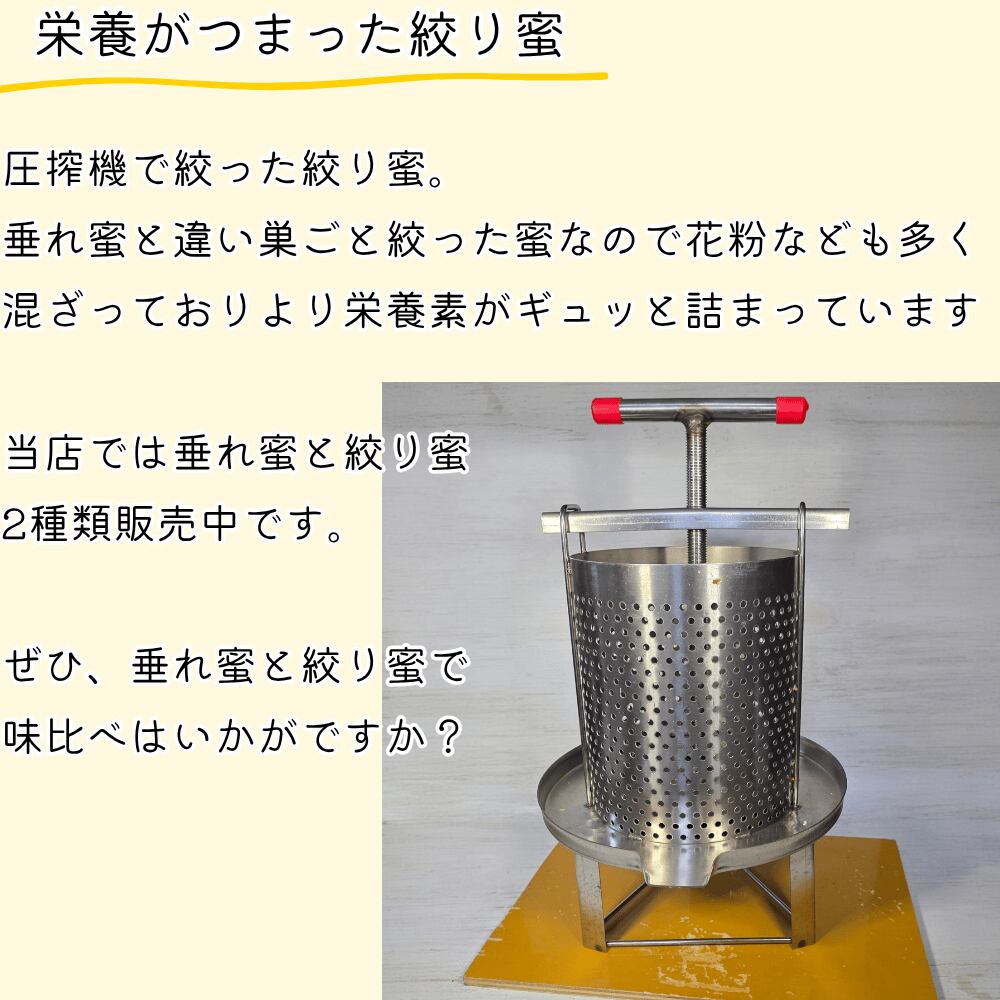 垂れ蜜と違い巣ごと絞った蜜なので花粉なども多く混ざっておりより栄養素がギュッと詰まっています、味は多少酸味などが強く雑味がある場合もあります。ぜひ垂れ蜜と味比べはいかがですか?