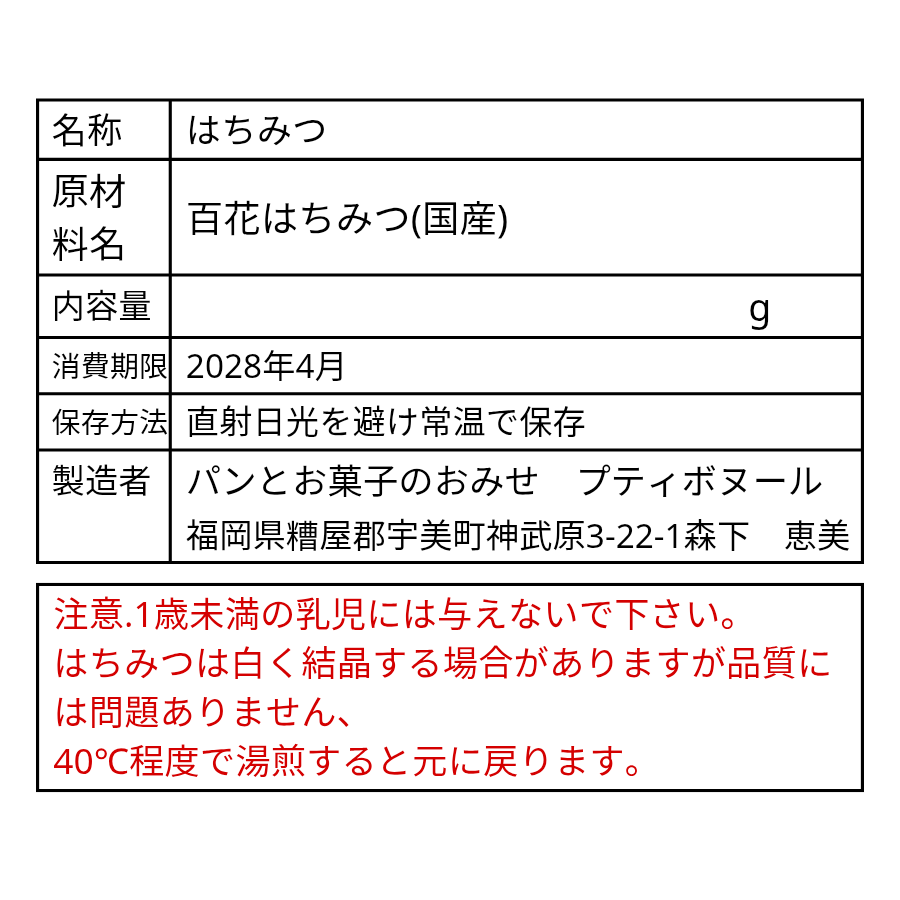 ・蜂蜜は、結晶化する場合がありますが、品質に問題はありません。40℃程度で湯煎するともとに戻ります。